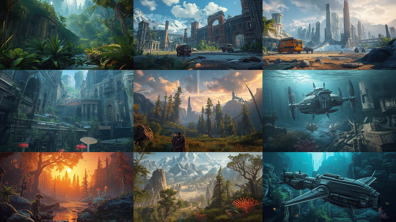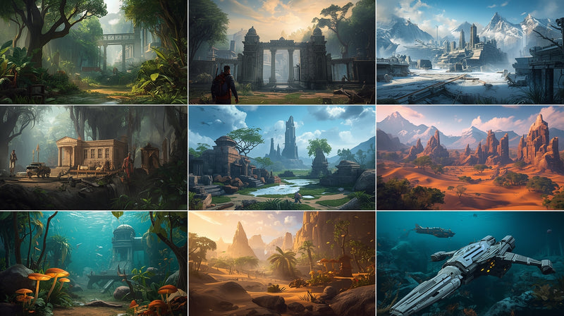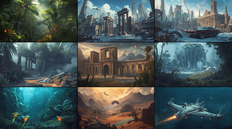 Many of our environments feature eco-conscious themes, such as renewable energy landscapes, green architecture, and natural world preservation.